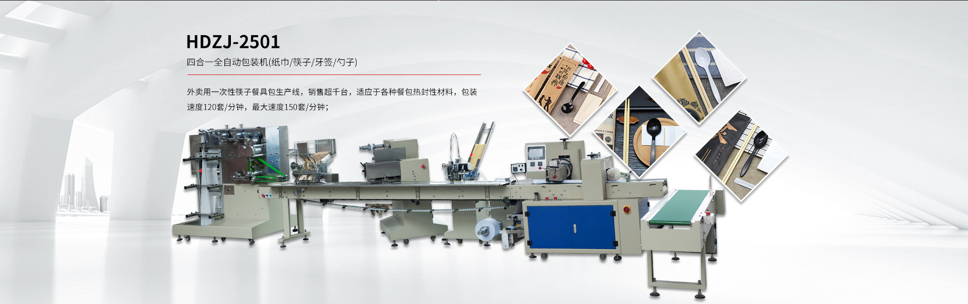 貴司專注于研發一次性紙巾筷子餐具包生產線、紙巾刀叉航空餐具包裝生產線、一次性餐具套裝四邊封生產線、塑料杯(碗)、吸管全自動點數自動包裝機及五金(塑料)制品包裝機等各類包裝機。